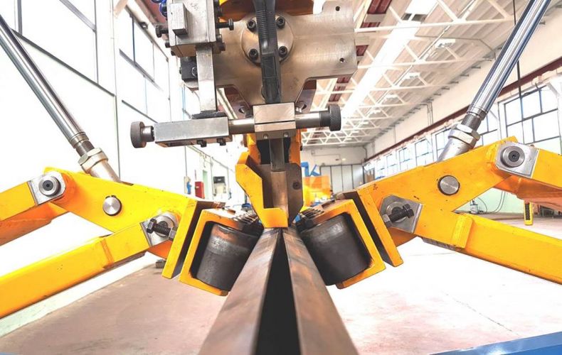This machine allows, starting from a bended trapezium, to weld the joint applying the correct force from the side and from the top in order to close the joint without any shape deformation. The machine is semi-automatic and has a pressure control on 3 axes, actuated by pneumatic cylinders. The operator can change the value of the force applied in accordance with the mechanical resistance (diameter and thickness).